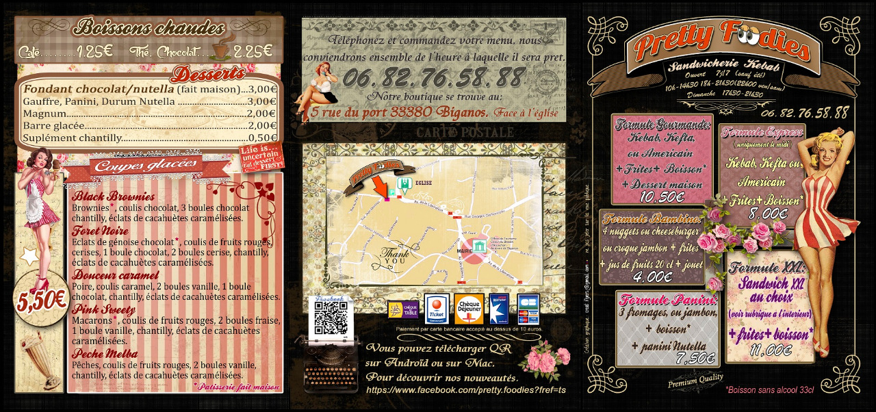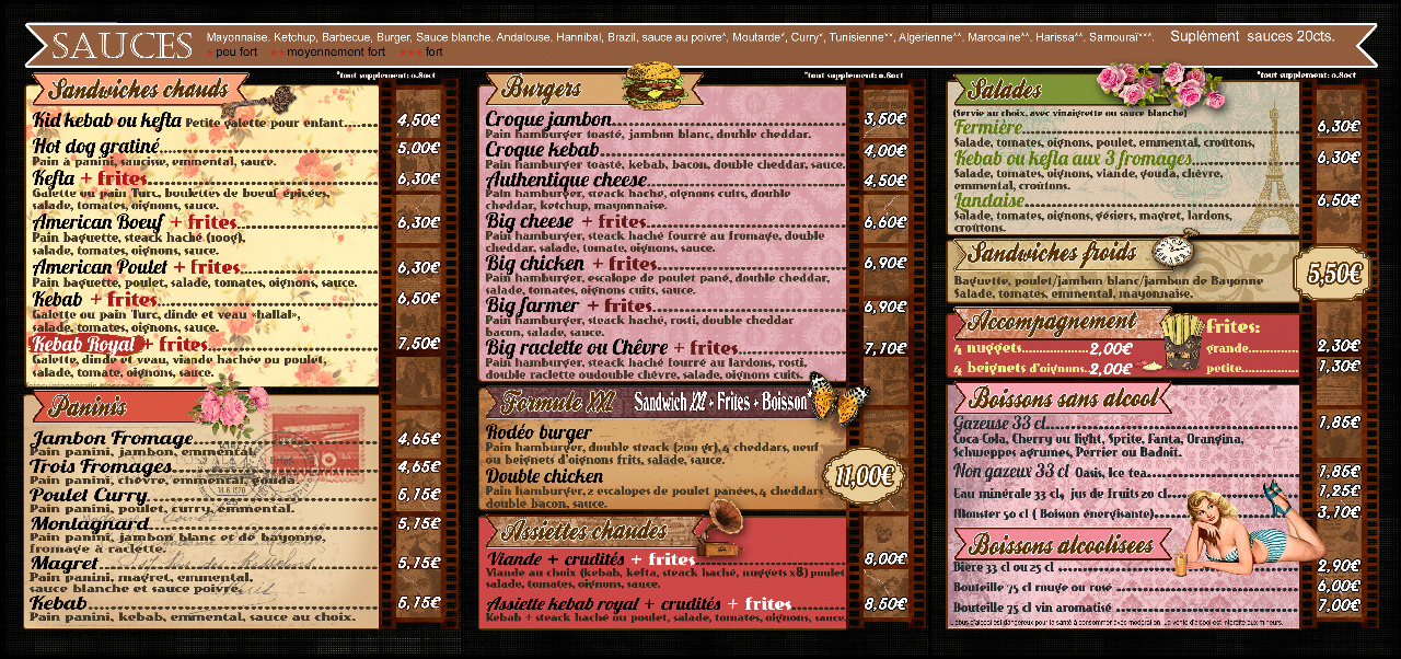 Nous préparons de la cuisine rapide comme des kebabs,burgers,paninis mais aussi des salades et assiettes chaudes dans des plats a emporter.Nous réalisons pour vous de la patisserie artisanale notamment nos fondants au chocolat coeur nutella!!!